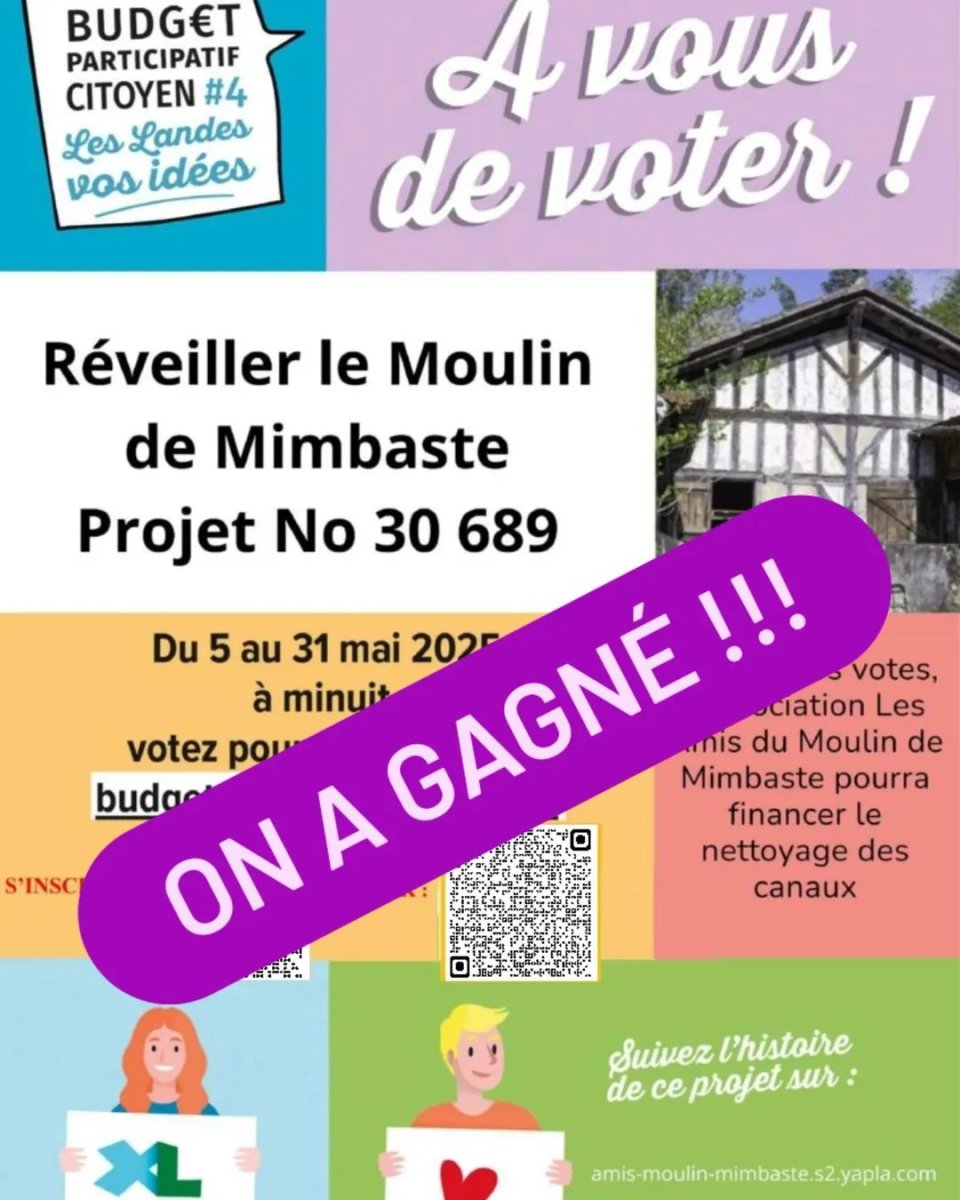 Grâce à vous l'association des amis du moulin de Mimbaste est lauréate du budget participatif. 50000€ pour faire les travaux nécessaires à ouvrir les vannes et faire tourner les meules de ce vieux moulin. C'est trop génial!! Merci, merci, merci.